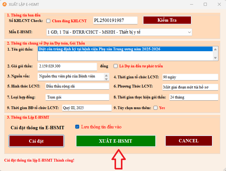 8. Sau khi cài đặt thông tin để lập E-HSMT thành công => click Xuất E-HSMT