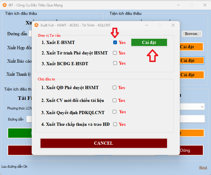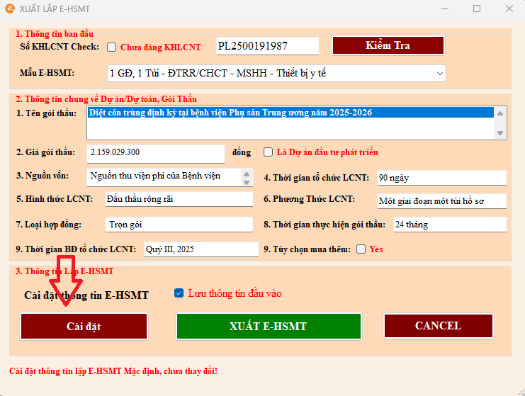 3. Chọn Cài đặt tại Xuất HSMT - BCĐG - KQLCNT