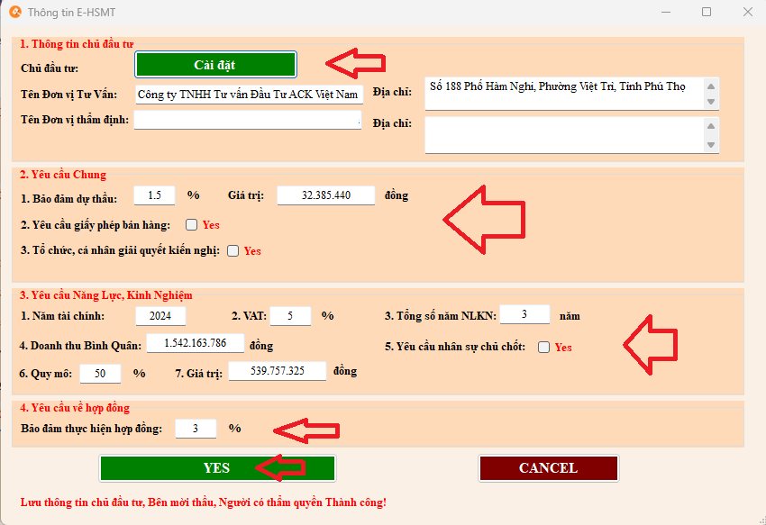 7. Cài đặt thông tin chủ đầu tư; Yêu cầu chung; Yêu cầu về năng lực, kinh nghiệm; Yêu cầu về hợp đồng => Sau đó click Yes.