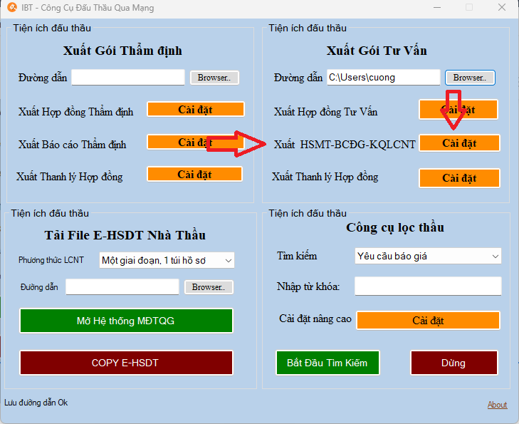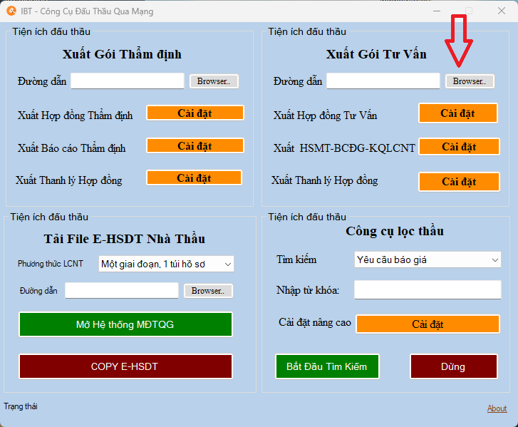 2. Tại giao diện chính của phần mềm, Tại Xuất gói thầu tư vấn => Chọn Đường dẫn (Browser) để lưu các file word mình tạo ra.
